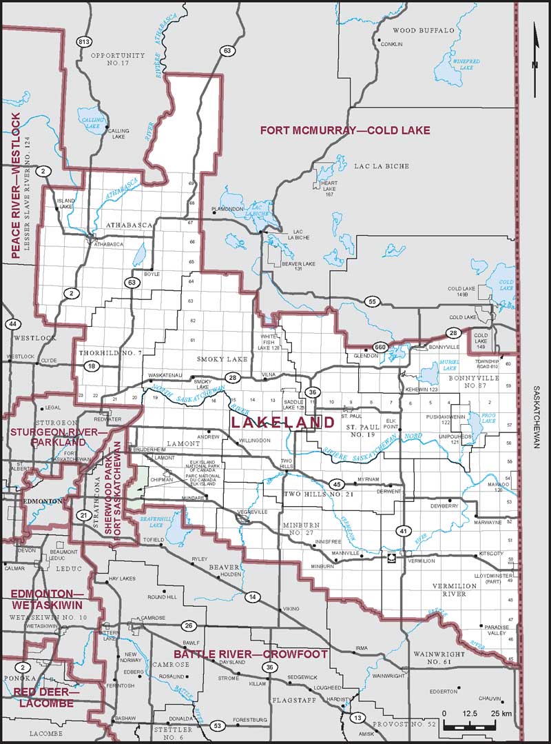 Comprend la partie de la province de l'Alberta décrite comme suit : commençant à l'intersection de la frontière est de ladite province et de la limite sud du comté de Vermilion River; de là généralement vers le nord-ouest et vers l'ouest suivant ladite limite, ensuite suivant la limite sud du comté de Minburn no 27 et suivant la limite sud du comté de Lamont jusqu'à la limite est du Parc national du Canada Elk Island; de là vers le sud, généralement vers l'ouest et généralement vers le nord suivant les limites est, sud et ouest dudit parc national jusqu'à la limite ouest du comté de Lamont; de là vers l'ouest et généralement vers le nord suivant ladite limite jusqu'à l'angle sud-ouest de la ville de Bruderheim; de là vers le nord suivant la limite ouest de ladite ville et la limite ouest du comté de Lamont jusqu'à la rive droite de la rivière Saskatchewan Nord; de là généralement vers le nord-est suivant ladite rive jusqu'à l'angle sud est du comté de Thorhild no 7; de là vers l'ouest et généralement vers le nord suivant les limites sud et ouest dudit comté jusqu'à la limite sud du comté d'Athabasca; de là vers l'ouest, généralement vers le nord-ouest, généralement vers le nord-est et généralement vers le sud suivant les limites sud, ouest, nord et est dudit comté jusqu'à la limite nord du comté de Smoky Lake; de là généralement vers l'est et généralement vers le sud-est suivant les limites nord et est dudit comté jusqu'à la limite nord-ouest de la réserve indienne de White Fish Lake no 128; de là généralement vers le nord-ouest et généralement vers le sud-est suivant les limites ouest et nord de ladite réserve indienne jusqu'à la limite ouest du comté de St. Paul no 19; de là vers le nord, généralement vers l'est et généralement vers le sud-est suivant les limites ouest, nord et est dudit comté jusqu'au chemin de canton 612; de là généralement vers l'est suivant ledit chemin et la route no 660 jusqu'à la route no 28; de là vers le nord-est suivant ladite route jusqu'à la limite ouest de la réserve indienne de Cold Lake no 149; de là vers le sud et vers l'est suivant les limites ouest et sud de ladite réserve jusqu'au chemin de canton 610; de là vers l'est suivant ledit chemin et son prolongement est jusqu'à un point sur la frontière est de la province de l'Alberta situé à environ 54°14'13" de latitude N et 110°00'20" de longitude O; de là vers le sud suivant ladite frontière jusqu'au point de départ.