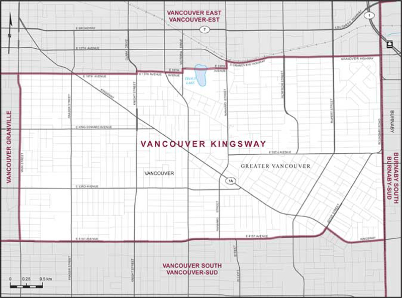 Comprend la partie de la ville de Vancouver décrite comme suit : commençant à l'intersection de la route Grandview et la limite est de ladite ville (chemin Boundary); de là vers le sud suivant ladite limite (chemin Boundary) jusqu'au Kingsway; de là vers l'ouest et le nord-ouest suivant Kingsway jusqu'à la rue Joyce; de là vers le sud-ouest suivant ladite rue jusqu'à la 41e Avenue Est; de là vers l'ouest suivant ladite avenue jusqu'à la rue Main; de là vers le nord suivant ladite rue jusqu'à la 16e Avenue Est; de là vers l'est suivant ladite avenue jusqu'à la rue Knight; de là vers le nord suivant ladite rue jusqu'à la 15e Avenue Est; de là vers l'est suivant ladite avenue et son prolongement jusqu'à la 16e Avenue Est; de là vers l'est suivant ladite avenue jusqu'à la promenade Victoria; de là vers le nord suivant ladite promenade jusqu'à la 15e Avenue Est; de là vers l'est suivant ladite avenue et son prolongement intermittent jusqu'à la rue Nanaimo; de là vers le nord suivant ladite rue jusqu'à la route Grandview Sud; de là vers l'est suivant ladite route et la route Grandview jusqu'au point de départ.