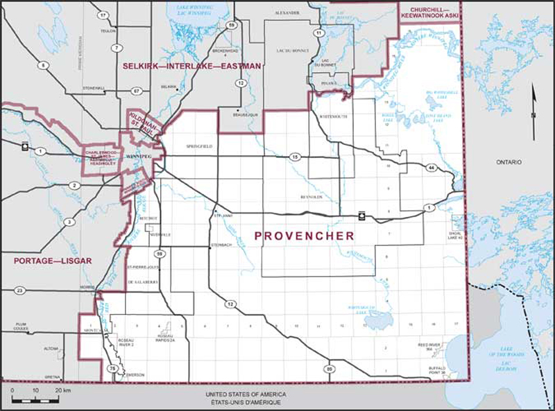 Comprend la partie de la province du Manitoba décrite comme suit : commençant à l’intersection de la frontière sud de ladite province avec la limite ouest de la municipalité rurale de Montcalm; de là généralement vers le nord et vers l’est suivant les limites ouest et nord de ladite municipalité rurale jusqu’à la limite ouest de la municipalité rurale de De Salaberry; de là vers le nord suivant ladite limite jusqu’à la limite sud de la municipalité rurale de Ritchot; de là vers l’ouest, généralement vers le nord et généralement vers le nord-est suivant les limites sud, ouest et nord de ladite municipalité rurale jusqu’à la limite ouest de la municipalité rurale de Springfield; de là généralement vers le nord, généralement vers le nord-est et généralement vers l’est suivant les limites ouest et nord de ladite municipalité rurale jusqu’à la limite ouest de la municipalité rurale de Reynolds; de là vers le nord et l’est suivant les limites ouest et nord de ladite municipalité rurale jusqu’à la limite ouest de la municipalité rurale de Whitemouth; de là vers le nord et généralement vers l’est suivant les limites ouest et nord de ladite municipalité rurale jusqu’à la limite est de la municipalité rurale de Lac du Bonnet; de là vers le nord suivant la limite est des municipalités rurales de Lac du Bonnet, Pinawa et Lac du Bonnet jusqu’à la limite sud de la municipalité rurale d’Alexander; de là vers l’est et généralement vers le nord suivant les limites sud et est de ladite municipalité rurale jusqu’à la limite nord du Tp 16; de là vers l’est suivant ladite limite jusqu’à la frontière est de la province du Manitoba; de là vers le sud et l’ouest suivant les frontières est et sud de ladite province jusqu’au point de départ.