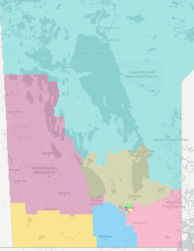 This submission consisted of two maps which outline 14 proposed electoral districts on the province of Manitoba, one showing the whole province and the other depicting only Winnipeg.