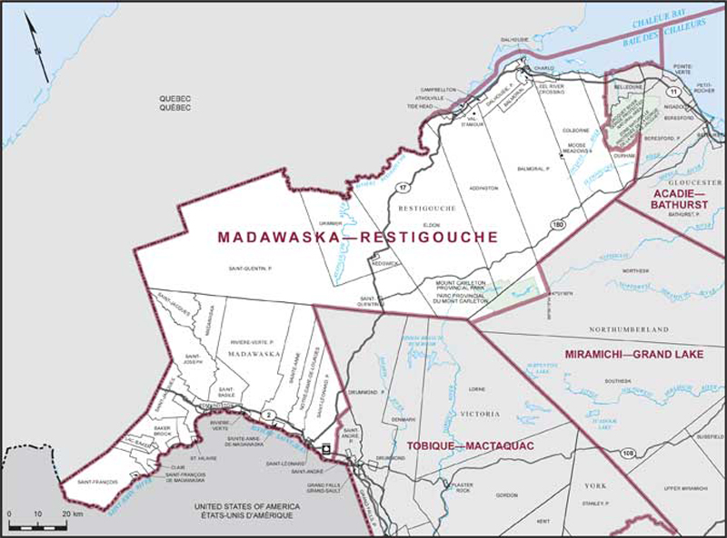 - (ii) de la partie du comté de Restigouche située au nord et à l'est d'une ligne décrite comme suit : commençant à l'intersection la plus au sud de la limite est du comté de Restigouche et de la limite de la zone naturelle protégée de la gorge de la rivière Jacquet; de là généralement vers le sud-ouest et généralement vers le nord-est suivant la limite de ladite zone naturelle protégée jusqu'à la limite sud du village de Belledune;