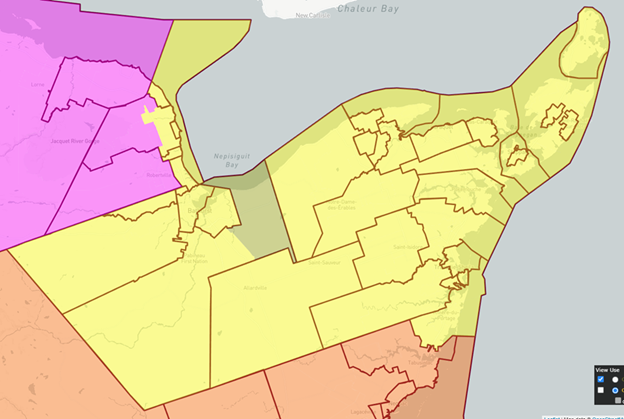 - Only Beresford Parish is split (between Madawaska-Restigouche and Acadie-Bathurst)