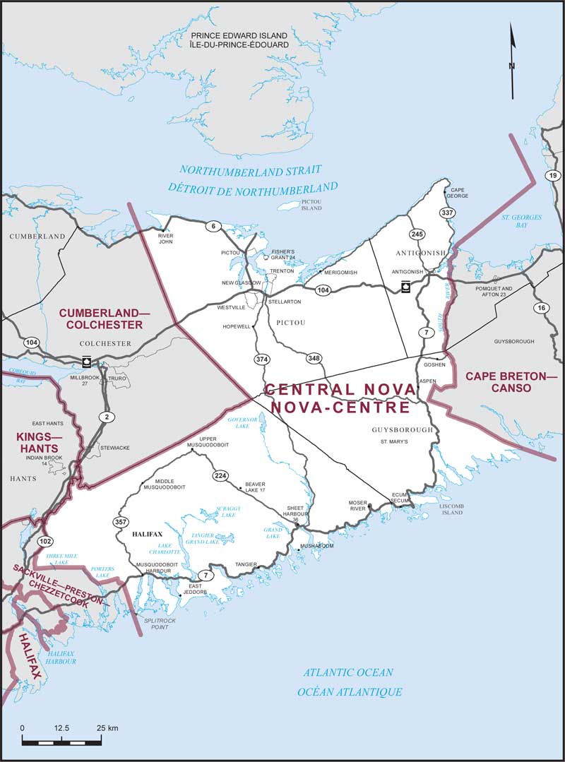 - b) la partie du comté d’Antigonish située à l’ouest et au nord d’une ligne décrite comme suit : commençant à l’intersection de la limite sud dudit comté et du lac South River; de là généralement vers le nord suivant ledit lac jusqu’à la rivière South; de là généralement vers le nord suivant ladite rivière jusqu’au havre d’Antigonish; de là généralement vers le nord suivant ledit havre, passant à l’est de l’île Blueberry, de l’île Reef, de l’île Fallis et de l’île Captains et à l’ouest de l’île Long, de l’île Sheep et de l’île Black jusqu’à la baie St. Georges; de là vers le nord-est suivant ladite baie jusqu’à la limite est dudit comté situé approximativement à 45°51’52” de latitude N et 61°34’07” de longitude O;
