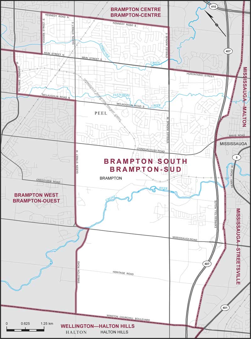 Comprend la partie de la municipalité régionale de Peel constituée de la partie de la ville de Brampton décrite comme suit : commençant à l'intersection de la limite sud-ouest de ladite ville et du chemin Embleton; de là généralement vers le nord-est suivant ledit chemin jusqu'au chemin Mississauga; de là vers le nord-ouest suivant ledit chemin jusqu'à la rue Queen Ouest; de là vers le nord-est suivant ladite rue jusqu'au chemin McLaughlin Nord; de là vers le nord-ouest suivant ledit chemin jusqu'à la promenade Williams Ouest; de là vers le nord-est suivant ladite promenade jusqu'à la rue Main Nord; de là vers le sud-est suivant ladite rue jusqu'à la rue Vodden Est; de là vers le nord-est suivant ladite rue jusqu'au chemin Kennedy Nord; de là vers le sud-est suivant ledit chemin et le chemin Kennedy Sud jusqu'à l'avenue Steeles Est; de là vers le sud-ouest suivant ladite avenue jusqu'à la rue Hurontario; de là vers le sud-est suivant ladite rue jusqu'à la limite sud-est de ladite ville; de là généralement vers le sud-ouest et le nord-ouest suivant les limites sud-est et sud-ouest de ladite ville jusqu'au point de départ.