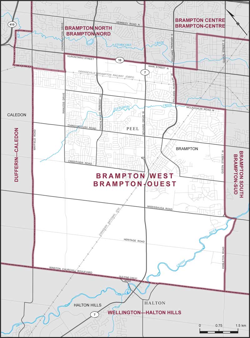 Comprend la partie de la municipalité régionale de Peel constituée de la partie de la ville de Brampton décrite comme suit : commençant à l'intersection de la limite nord-ouest de ladite ville et de la voie ferrée Orangeville—Brampton; de là vers le sud-est suivant ladite voie ferrée jusqu'à la promenade Wanless; de là vers le nord-est suivant ladite promenade jusqu'à la rue Hurontario; de là vers le sud-est suivant ladite rue et la rue Main Nord jusqu'à la promenade Williams Ouest; de là vers le sud ouest suivant ladite promenade jusqu'au chemin McLaughlin Nord; de là vers le sud-est suivant ledit chemin jusqu'à la rue Queen Ouest; de là vers le sud-ouest suivant ladite rue jusqu'au chemin Mississauga; de là vers le sud-est suivant ledit chemin jusqu'au chemin Embleton; de là généralement vers le sud-ouest suivant ledit chemin jusqu'à la limite sud-ouest de ladite ville; de là vers le nord-ouest et généralement vers le nord-est suivant les limites sud-ouest et nord-ouest de ladite ville jusqu'au point de départ.