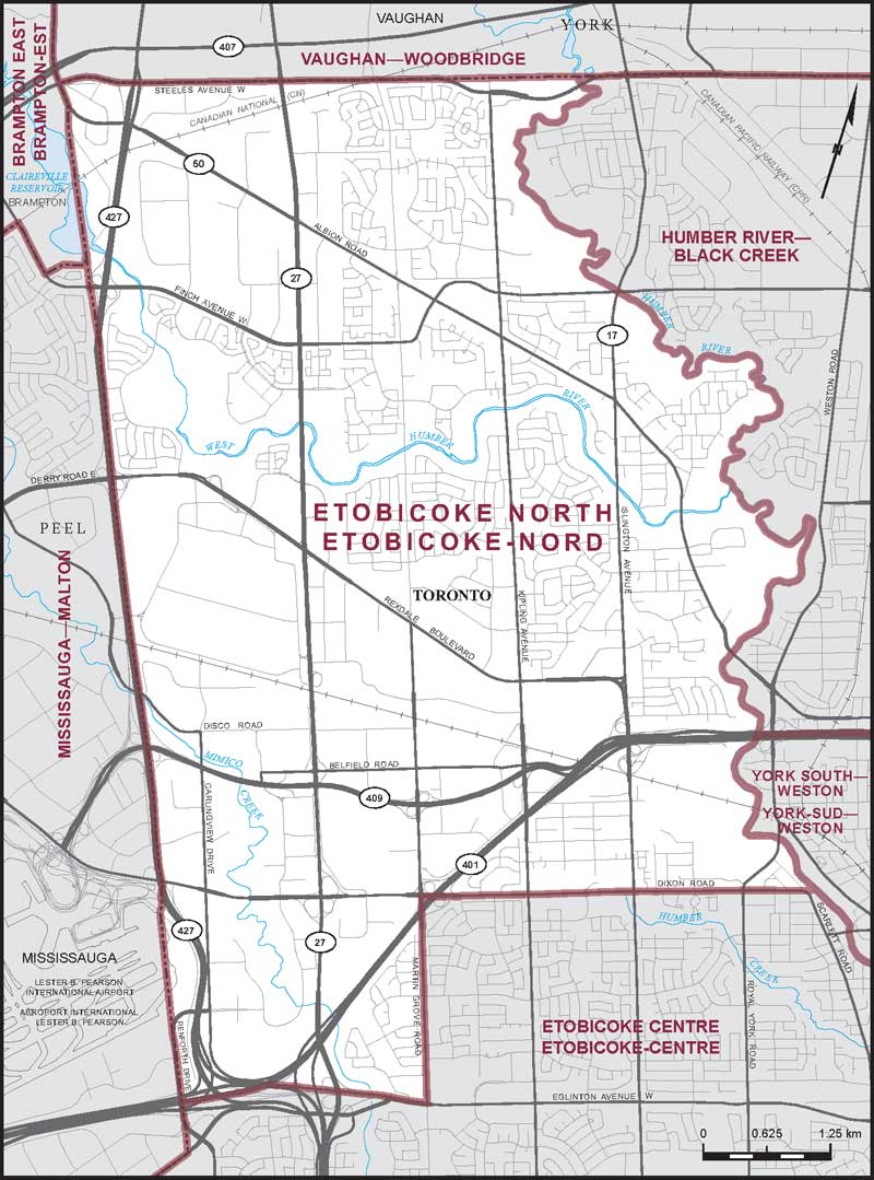 Comprend la partie de la ville de Toronto décrite comme suit : commençant à l'intersection de la limite nord de ladite ville et de la rivière Humber; de là généralement vers le sud suivant ladite rivière jusqu'au prolongement vers l'est du chemin Dixon; de là vers l'ouest suivant ledit prolongement et le chemin Dixon jusqu'au chemin Martin Grove; de là vers le sud suivant ledit chemin jusqu'à l'avenue Eglinton Ouest; de là vers l'ouest suivant ladite avenue et l'autoroute no 427 jusqu'à l'autoroute no 401; de là vers le sud-ouest suivant ladite autoroute jusqu'à la limite ouest de la ville de Toronto; de là vers le nord et l'est suivant les limites ouest et nord de ladite ville jusqu'au point de départ.