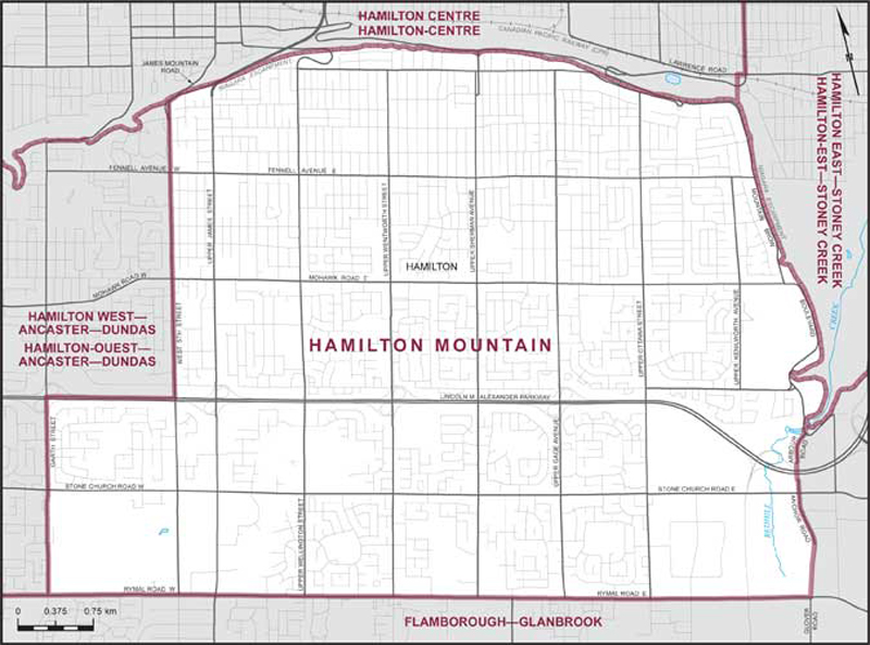Comprend la partie de la ville de Hamilton décrite comme suit : commençant à l'intersection de l'escarpement du Niagara et du ruisseau Redhill; de là vers l'ouest suivant ledit ruisseau jusqu'au boulevard Mountain Brow; de là vers le sud suivant ledit boulevard jusqu'au chemin Arbour; de là généralement vers le sud suivant ledit chemin, son prolongement intermittent, le chemin Anchor et son prolongement vers le sud jusqu'à l'intersection du chemin Rymal Est et du chemin Glover; de là vers l'ouest suivant le chemin Rymal Est et le chemin Rymal Ouest jusqu'à la rue Garth; de là vers le nord suivant ladite rue jusqu'à la promenade Lincoln M. Alexander; de là vers l'est suivant ladite promenade jusqu'à la rue West 5th; de là vers le nord suivant ladite rue jusqu'au chemin James Mountain; de là généralement vers le nord-est suivant ledit chemin jusqu'à l'escarpement du Niagara; de là généralement vers l'est et généralement vers le sud suivant ledit escarpement jusqu'au point de départ.