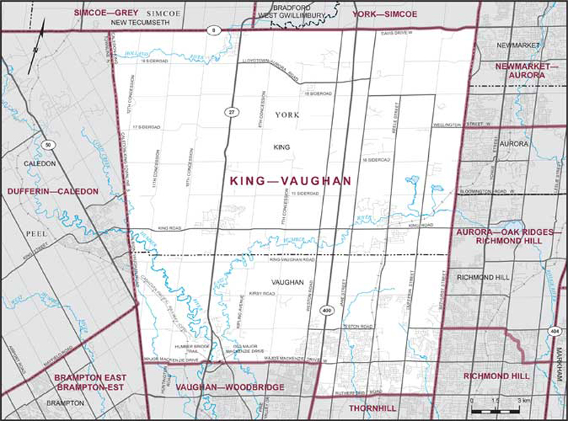 - b) de la partie de la ville de Vaughan située au nord et à l'est d'une ligne décrite comme suit : commençant à l'intersection de la limite ouest de ladite ville et de la promenade Major Mackenzie; de là vers l'est suivant ladite promenade jusqu'au chemin Huntington; de là vers le sud suivant ledit chemin jusqu'à la promenade Major Mackenzie; de là généralement vers l'est suivant ladite promenade jusqu'à Humber Bridge Trail; de là vers l'est suivant Humber Bridge Trail et son prolongement vers l'est jusqu'à la promenade Old Major Mackenzie; de là vers l'est et vers le sud-est suivant ladite promenade jusqu'à la promenade Major Mackenzie; de là vers le nord-est et vers l'est suivant ladite promenade jusqu'à l'autoroute no 400; de là vers le sud suivant ladite autoroute jusqu'au chemin Rutherford; de là vers l'est suivant ledit chemin jusqu'à la limite est de ladite ville.