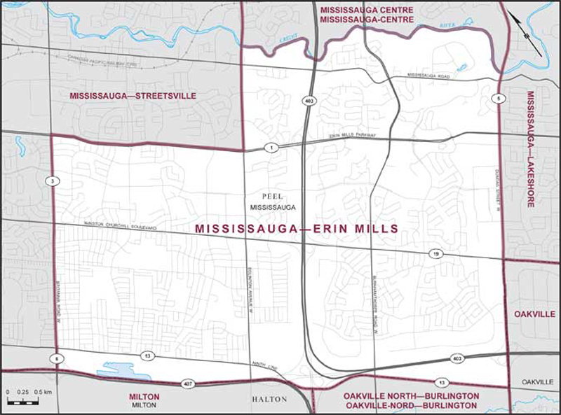 Comprend la partie de la municipalité régionale de Peel constituée de la partie de la ville de Mississauga décrite comme suit : commençant à l'intersection de la limite sud-ouest de ladite ville et du chemin Britannia Ouest; de là vers le nord-est suivant ledit chemin jusqu'à la promenade Erin Mills; de là vers le sud-est suivant ladite promenade jusqu'à l'avenue Eglinton Ouest; de là vers le nord-est suivant ladite avenue jusqu'à la rivière Credit; de là généralement vers le sud-est suivant ladite rivière jusqu'à la rue Dundas Ouest; de là vers le sud-ouest suivant ladite rue jusqu'à la limite sud-ouest de ladite ville; de là vers le nord-ouest suivant ladite limite jusqu'au point de départ.