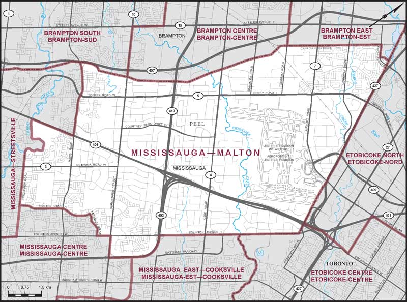 Comprend la partie de la municipalité régionale de Peel constituée de la partie de la ville de Mississauga décrite comme suit : commençant à l'intersection de la limite nord-ouest de ladite ville et du chemin Mavis; de là vers le sud-est suivant ledit chemin jusqu'à l'autoroute no 401; de là vers le sud-ouest suivant ladite autoroute jusqu'à la rivière Credit; de là vers le sud-est, généralement vers le nord-est et généralement vers le sud suivant ladite rivière jusqu'au chemin Creditview; de là vers le sud-est suivant ledit chemin jusqu'au chemin Bristol Ouest; de là généralement vers le nord-est suivant ledit chemin jusqu'à la promenade Fairwind; de là généralement vers l'est suivant ladite promenade jusqu'à l'avenue Eglinton Ouest; de là vers le nord-est suivant ladite avenue jusqu'à la rue Hurontario; de là vers le sud-est suivant ladite rue jusqu'à l'autoroute no 403; de là vers le nord-est et le nord-ouest suivant ladite autoroute jusqu'à l'avenue Eglinton Est; de là vers le nord-est suivant ladite avenue jusqu'à la limite nord-est de ladite ville; de là vers le nord-est, vers le nord-ouest et généralement vers le sud-ouest suivant les limites nord-est et nord-ouest de ladite ville jusqu'au point de départ.