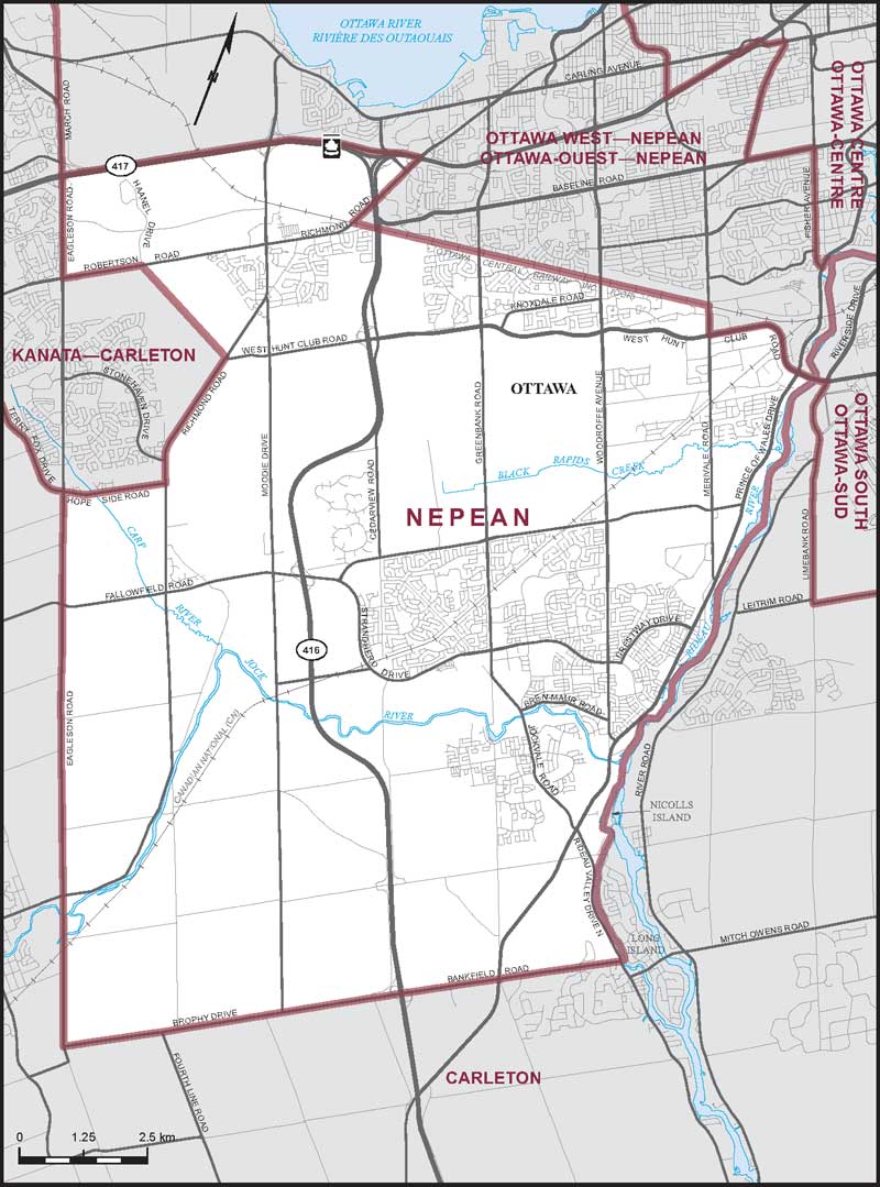 Comprend la partie de la ville d'Ottawa décrite comme suit : commençant à l'intersection du chemin Richmond et de l'autoroute no 417; de là vers le sud-ouest suivant ladite autoroute jusqu'au chemin March; de là vers le sud-est suivant ledit chemin et le chemin Eagleson jusqu'au chemin Robertson; de là vers le nord-est suivant ledit chemin jusqu'à la promenade Haanel; de là vers le sud-est en ligne droite jusqu'à l'intersection du chemin West Hunt Club avec le chemin Richmond; de là vers le sud suivant le chemin Richmond jusqu'au chemin Hope Side; de là vers le sud-ouest suivant ledit chemin jusqu'au chemin Eagleson; de là vers le sud-est suivant ledit chemin jusqu'à la promenade Brophy; de là vers le nord-est suivant ladite promenade, le chemin Bankfield et son prolongement vers le nord-est jusqu'à la rivière Rideau (à l'ouest de l'île Long); de là vers le nord-ouest et généralement vers le nord suivant ladite rivière (à l'ouest de l'île Long et de l'île Nicolls) jusqu'au chemin West Hunt Club; de là vers l'ouest, vers le nord-ouest et vers le sud-ouest suivant ledit chemin jusqu'au chemin Merivale; de là vers le nord-ouest suivant ledit chemin jusqu'à la voie ferrée du Canadien National; de là vers l'ouest suivant ladite voie ferrée jusqu'au chemin Richmond; de là vers le nord suivant ledit chemin jusqu'au point de départ.