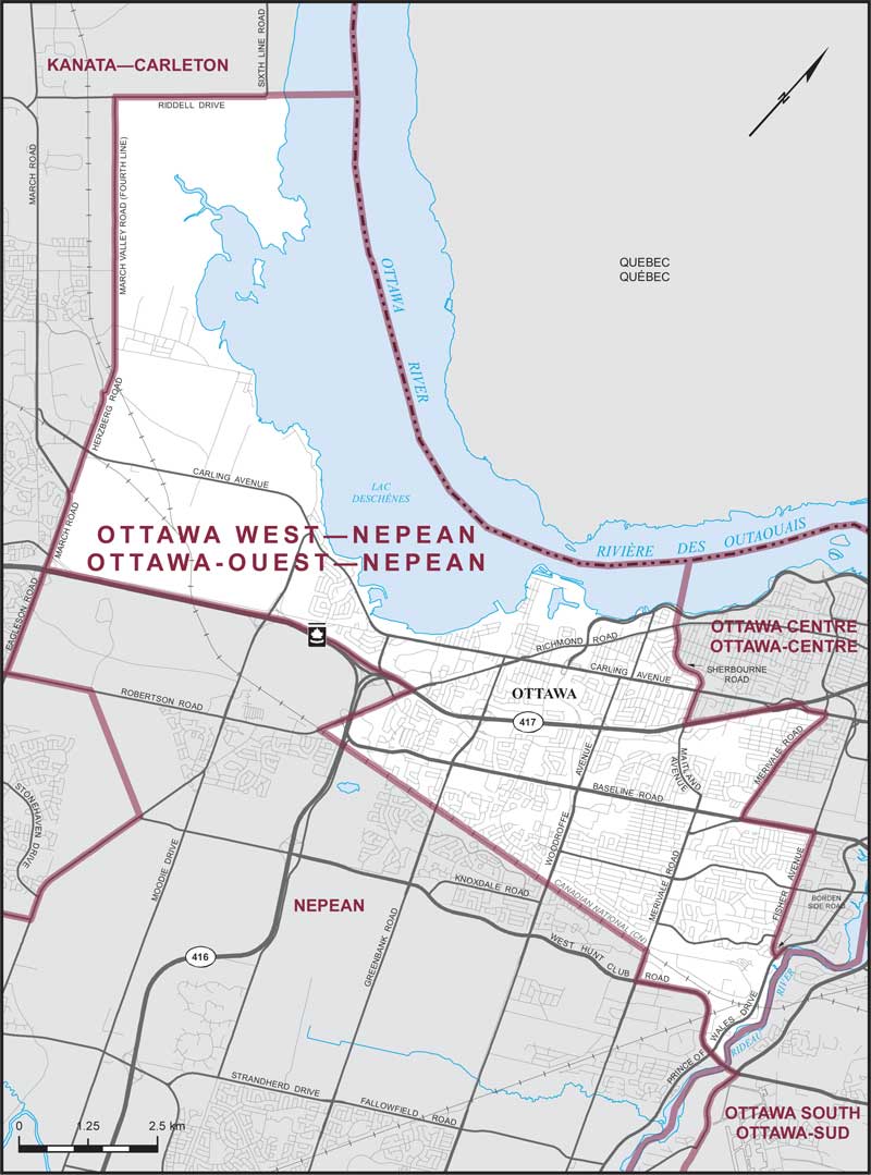 Comprend la partie de la ville d'Ottawa décrite comme suit : commençant à l'intersection de la frontière interprovinciale entre l'Ontario et le Québec et une ligne N 30°00' O depuis l'intersection du prolongement nord-ouest du chemin Sherbourne avec le chemin Richmond; de là S 30°00' E jusqu'à l'intersection dudit prolongement avec le chemin Richmond; de là généralement vers le sud-est suivant ledit prolongement, le chemin Sherbourne et l'avenue Maitland jusqu'à l'autoroute no 417; de là vers le nord-est suivant ladite autoroute jusqu'à l'avenue Carling; de là généralement vers le nord-est suivant ladite avenue jusqu'au chemin Merivale; de là généralement vers le sud suivant ledit chemin jusqu'au chemin Baseline; de là vers le nord-est suivant ledit chemin jusqu'à l'avenue Fisher; de là vers le sud-est suivant ladite avenue jusqu'à la promenade Prince of Wales; de là vers le nord suivant ladite promenade jusqu'au chemin Borden Side; de là vers l'est suivant le prolongement est dudit chemin jusqu'à la rivière Rideau; de là généralement vers le sud suivant ladite rivière jusqu'au chemin West Hunt Club; de là vers l'ouest, vers le nord-ouest et vers le sud-ouest suivant ledit chemin jusqu'au chemin Merivale; de là vers le nord-ouest suivant ledit chemin jusqu'à la voie ferrée du Canadien National; de là vers l'ouest suivant ladite voie ferrée jusqu'au chemin Richmond; de là vers le nord suivant ledit chemin jusqu'à l'autoroute no 417; de là vers le sud-ouest suivant ladite autoroute jusqu'au chemin March; de là vers le nord-ouest suivant ledit chemin, le chemin Herzberg et le chemin March Valley (Fourth Line) jusqu'à la promenade Riddell; de là vers le nord-est suivant ladite promenade et son prolongement jusqu'à la frontière interprovinciale entre l'Ontario et le Québec; de là vers le sud-est et le nord-est suivant ladite frontière jusqu'au point de départ.