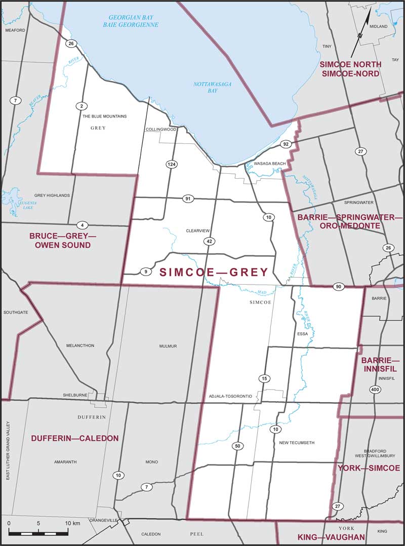- a) la partie du comté de Simcoe constituée : des villes de Collingwood, New Tecumseth et de Wasaga Beach; des cantons d’Adjala-Tosorontio, Clearview et d’Essa;