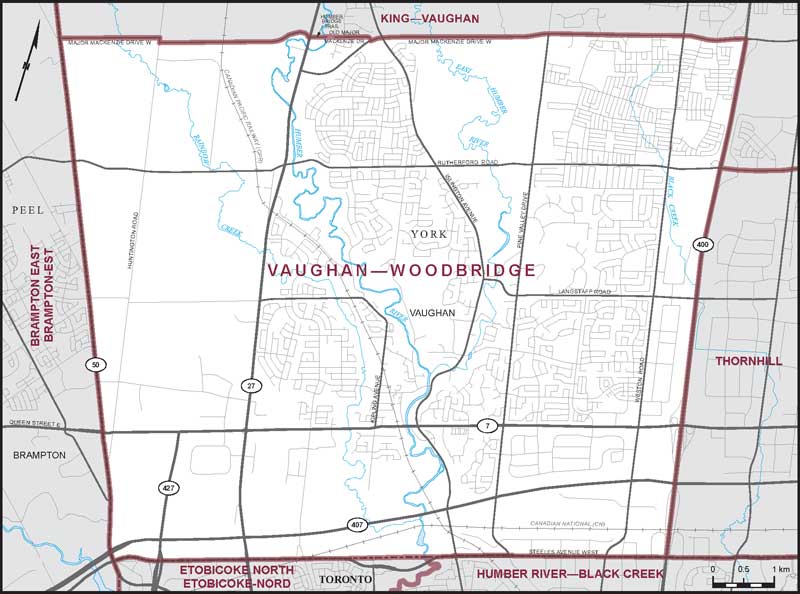 Comprend la partie de la municipalité régionale de York constituée de la partie de la ville de Vaughan située au sud et à l’ouest d’une ligne décrite comme suit : commençant à l’intersection de la limite ouest de ladite ville et de la promenade Major Mackenzie; de là vers l’est suivant ladite promenade jusqu’au chemin Huntington; de là vers le sud suivant ledit chemin jusqu’à la promenade Major Mackenzie; de là généralement vers l’est suivant ladite promenade jusqu’à Humber Bridge Trail; de là vers l’est suivant Humber Bridge Trail et son prolongement vers l’est jusqu’à la promenade Old Major Mackenzie; de là vers l’est et vers le sud-est suivant ladite promenade jusqu’à la promenade Major Mackenzie; de là vers le nord-est et vers l’est suivant ladite promenade jusqu’à l’autoroute no 400; de là vers le sud suivant ladite route jusqu’à la limite sud de ladite ville.