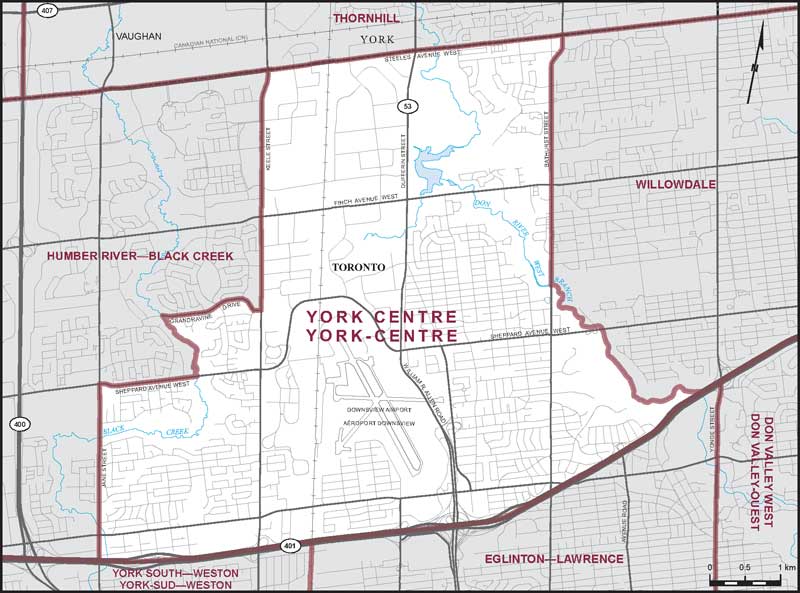 Comprend la partie de la ville de Toronto décrite comme suit : commençant à l’intersection de la limite nord de ladite ville et de la rue Keele; de là vers le sud suivant ladite rue jusqu’à la promenade Grandravine; de là généralement vers l’ouest suivant ladite promenade jusqu’au ruisseau Black; de là généralement vers le sud-est suivant ledit ruisseau jusqu’à l’avenue Sheppard Ouest; de là vers l’ouest suivant ladite avenue jusqu’à la rue Jane; de là vers le sud suivant ladite rue jusqu’à l’autoroute no 401; de là vers l’est et vers le nord-est suivant ladite autoroute jusqu’à la branche ouest de la rivière Don; de là généralement vers le nord-ouest suivant ladite branche jusqu’à la rue Bathurst; de là vers le nord suivant ladite rue jusqu’à la limite nord de ladite ville; de là vers l’ouest suivant ladite limite jusqu’au point de départ.