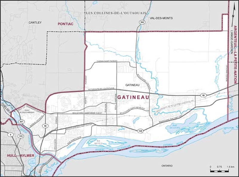 Consisting of that part of the City of Gatineau described as follows: commencing at the intersection of the northerly limit of said city with Saint-Joseph Boulevard; thence easterly in a straight line to the Gatineau River; thence generally southeasterly along said river to the southerly limit of the City of Gatineau (Ottawa River); thence generally northeasterly along said limit and said river to the easterly limit of the sector of Gatineau; thence northerly along said limit to the northerly limit of the City of Gatineau; thence generally westerly along said limit to Montée Paiement; thence generally southerly along Montée Paiement to Highway No. 50 (de l'Outaouais Highway); thence westerly and southerly along said highway to La Vérendrye Boulevard West; thence northwesterly and southwesterly along said boulevard and du Pont Avenue to the northerly limit of the City of Gatineau (Alonzo-Wright Bridge); thence generally southerly along said limit to the point of commencement.