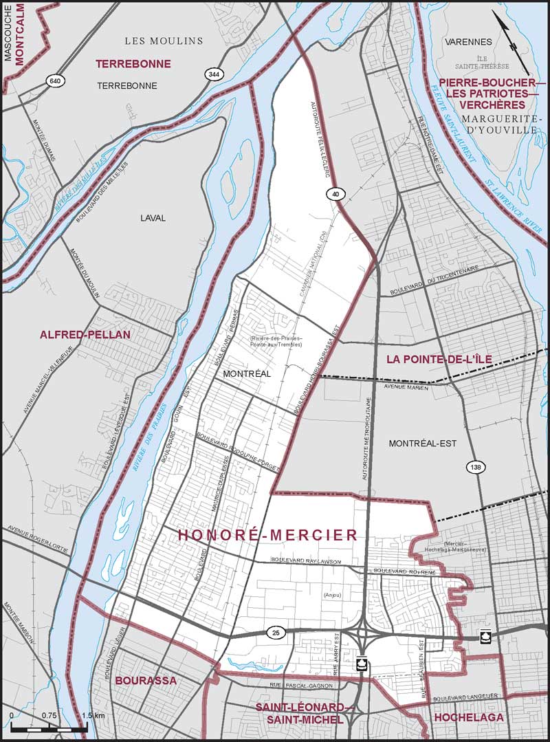 - (b) that part of the borough of Rivière-des-Prairies–Pointe-aux-Trembles lying westerly of a line described as follows: commencing at the intersection of the northeasterly limit of the City of Montréal-Est with Henri-Bourassa Boulevard East; thence northeasterly along said boulevard to Highway No. 40 (Félix-Leclerc Highway); thence northerly along said highway to the northerly limit of the City of Montréal; and
