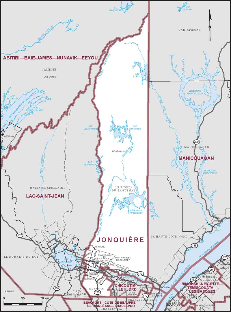 - (b) that part of the Regional County Municipality of Fjord-du-Saguenay comprised of: the municipalities of Bégin, Larouche, Saint-Ambroise, Saint-Charles-de-Bourget, Saint-David-de-Falardeau, Saint-Fulgence and Saint-Honoré; the Parish Municipality of Sainte-Rose-du-Nord; the unorganized territories of Mont-Valin and Lac-Ministuk; and