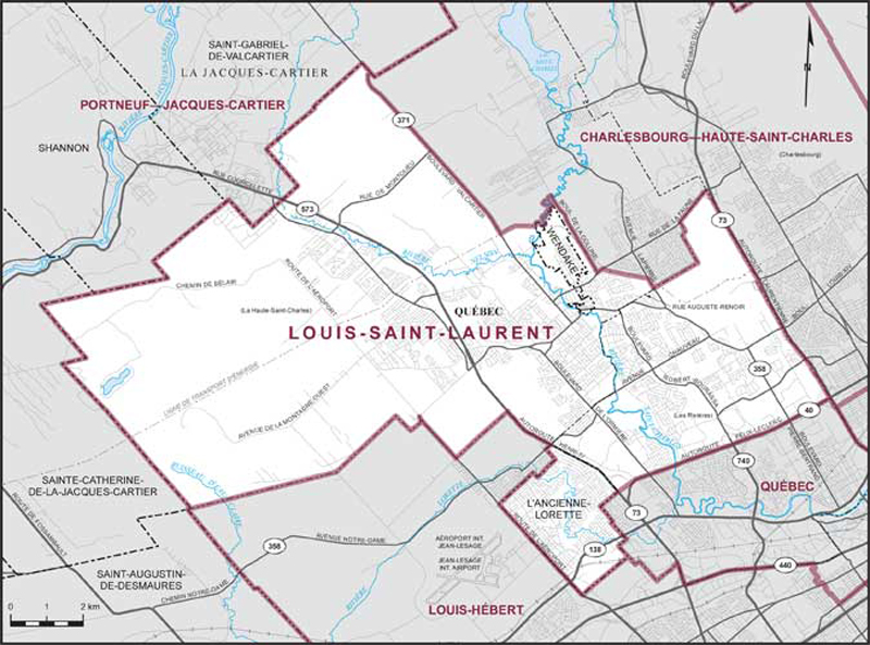 - (ii) that part of the borough of La Haute-Saint-Charles lying southwesterly of a line described as follows: commencing at the intersection of the northerly limit of the City of Québec with Valcartier Boulevard; thence generally southeasterly along said boulevard to the transmission line; thence generally easterly along said transmission line to the Saint-Charles River; thence generally northeasterly along said river to de la Colline Boulevard; thence southeasterly along said boulevard to de la Faune Street; thence northeasterly along said street to the transmission line; thence easterly along said transmission line to Lapierre Avenue; thence southeasterly along said avenue to the southeasterly limit of the borough of La Haute-Saint-Charles (Auguste-Renoir Street), including Wendake Indian Reserve.