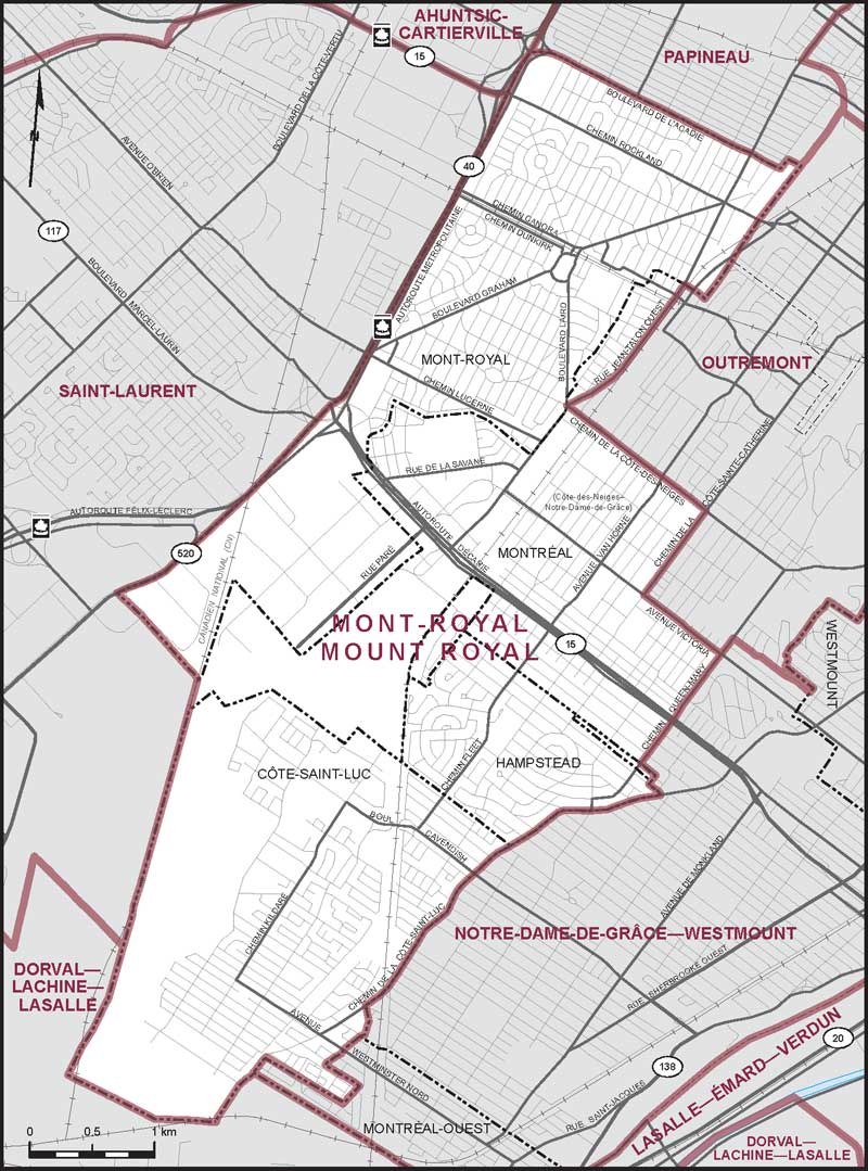 - (b) that part of the City of Montréal comprised of that part of the borough of Côte-des-Neiges–Notre-Dame-de-Grâce lying northwesterly of Jean-Talon Street West, and that part lying southwesterly and northwesterly of a line described as follows: commencing at the intersection of de la Côte-des-Neiges Road and the northwesterly limit of said borough; thence southeasterly along said road to de la Côte-Sainte-Catherine Road; thence southwesterly along said road to Victoria Avenue; thence southeasterly along said avenue to Queen-Mary Road; thence southwesterly along said road to the southwesterly limit of the borough of Côte-des-Neiges–Notre-Dame-de-Grâce.