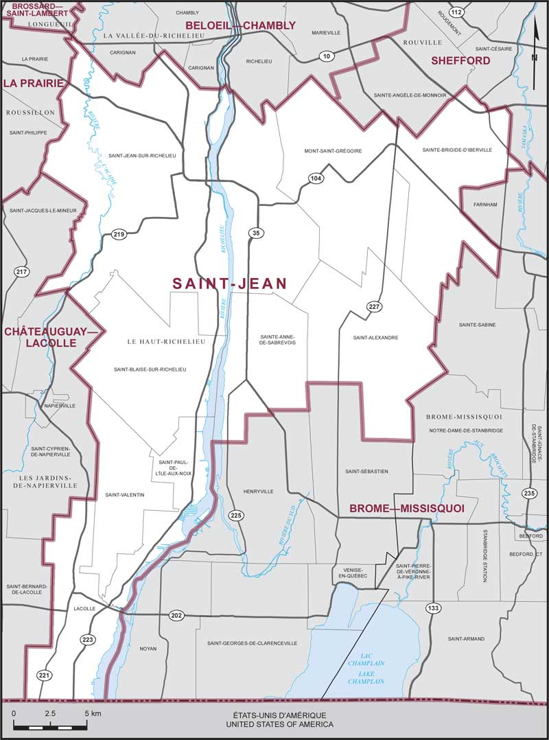 Consisting of that part of the Regional County Municipality of Le Haut-Richelieu comprised of: the City of Saint-Jean-sur-Richelieu; the Parish Municipality of Sainte-Anne-de-Sabrevois; the municipalities of Lacolle, Mont-Saint-Grégoire, Saint-Alexandre, Saint-Blaise-sur-Richelieu, Saint-Paul-de-l’Île-aux-Noix, Saint-Valentin and Sainte-Brigide-d'Iberville.