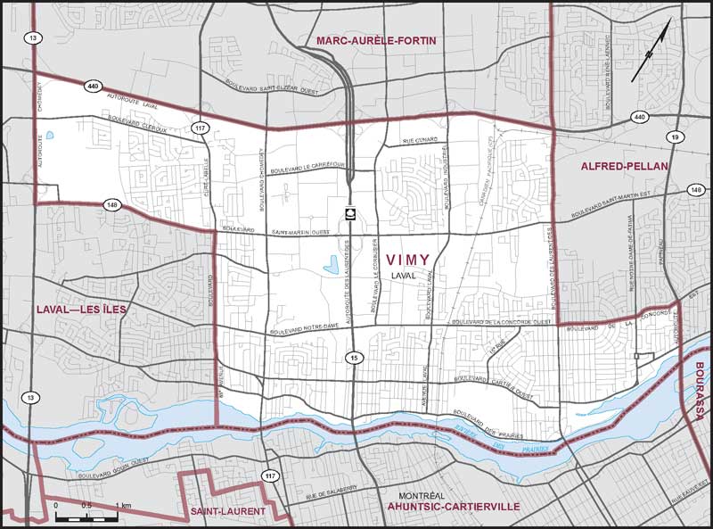 Consisting of that part of the City of Laval described as follows: commencing at the intersection of Highway No. 19 (Papineau Highway) with de la Concorde Boulevard East; thence southeasterly along Highway No. 19 (Papineau Highway) to the southeasterly limit of said city; thence generally southwesterly along said limit to its intersection with the southeasterly production of 83rd Avenue; thence northwesterly along said production, 83rd Avenue and Curé-Labelle Boulevard to Saint-Martin Boulevard West; thence southwesterly along said boulevard and its production to Highway No. 13 (Chomedey Highway); thence northwesterly along said highway to Highway No. 440 (Laval Highway West); thence northeasterly along said highway to des Laurentides Boulevard; thence southeasterly along said boulevard to de la Concorde Boulevard East; thence generally northeasterly along said boulevard to the point of commencement.