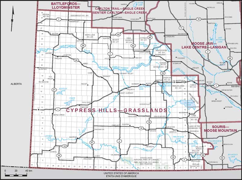 Comprend la partie de la province de la Saskatchewan décrite comme suit : commençant à l'extrémité sud-ouest de ladite province; de là vers le nord suivant la frontière ouest de ladite province jusqu'à la limite nord de la municipalité rurale de Milton no 292; de là vers l'est suivant ladite limite et la limite nord de la municipalité rurale de Kindersley no 290 jusqu'à la limite est de ladite municipalité; de là vers le sud suivant ladite limite jusqu'à la limite nord de la municipalité rurale de Snipe Lake no 259; de là vers l'est suivant ladite limite et la limite nord de la municipalité rurale de Monet no 257 jusqu'à la limite est de ladite municipalité; de là vers le sud suivant ladite limite jusqu'à la limite nord de la municipalité rurale de King George no 256; de là vers l'est suivant ladite limite et la limite nord de la municipalité rurale de Coteau no 255 jusqu'à la limite est de ladite municipalité rurale; de là généralement vers le sud-est suivant ladite limite jusqu'à la limite nord de la municipalité rurale de Maple Bush no 224; de là vers l'est et le sud suivant les limites nord et est de ladite municipalité rurale jusqu'à la limite nord de la municipalité rurale d'Enfield no 194; de là vers le sud suivant la limite est de ladite municipalité rurale jusqu'à la limite nord de la municipalité rurale de Chaplin no 164; de là vers l'est suivant ladite limite et les limites nord des municipalités rurales de Wheatlands no 163 et de Caron no 162 jusqu'à la limite est de la municipalité rurale de Caron no 162; de là vers le sud suivant ladite limite et les limites est des municipalités rurales de Hillsborough no 132 et de Lake Johnston no 102 jusqu'à la limite nord de la municipalité rurale de Lake of the Rivers no 72; de là vers l'est et le sud suivant les limites nord et est de ladite municipalité rurale jusqu'à la limite nord de la municipalité rurale de Willow Bunch no 42; de là vers l'est, généralement vers l'est et généralement vers le sud-ouest suivant les limites nord, est et sud de ladite municipalité rurale jusqu'à la limite est de la municipalité rurale de Poplar Valley no 12; de là généralement vers le sud suivant ladite limite jusqu'à la frontière sud de la province de la Saskatchewan; de là vers l'ouest suivant ladite frontière jusqu'au point de départ.