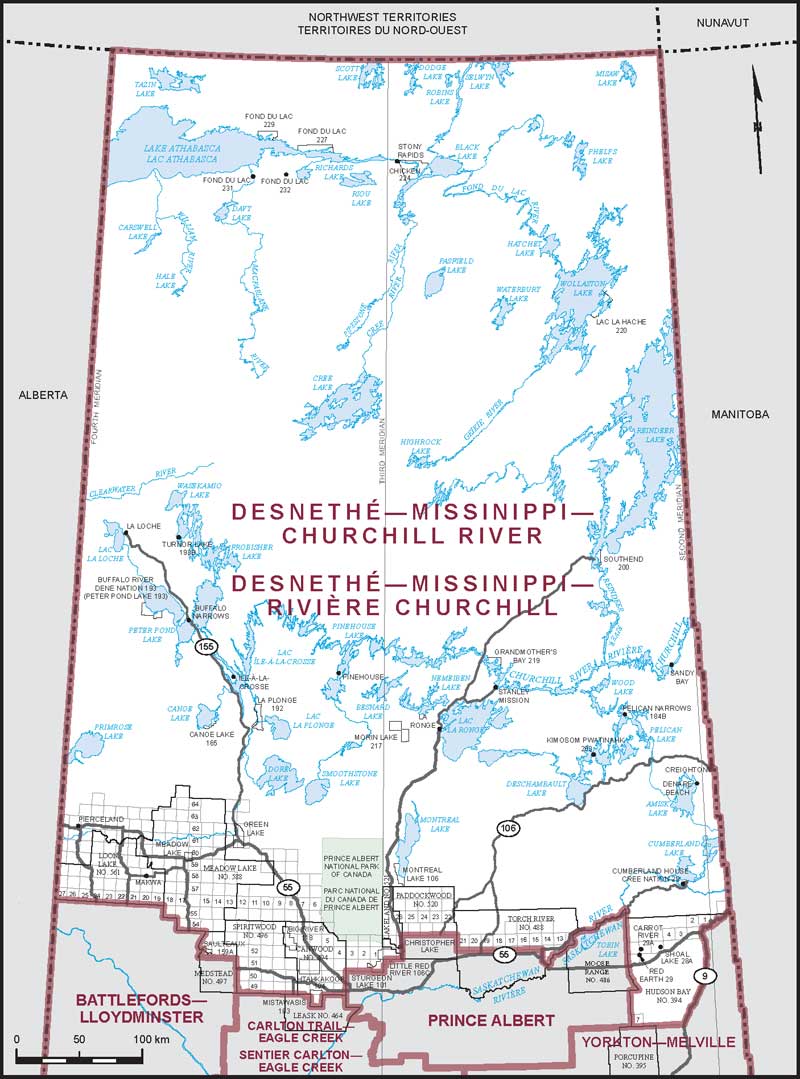 Comprend la partie de la province de la Saskatchewan située au nord d'une ligne décrite comme suit : commençant à l'intersection de la frontière ouest de ladite province et de la limite sud du Tp 56; de là vers l'est suivant ladite limite et la limite sud de la municipalité rurale de Loon Lake no 561 jusqu'à la limite ouest de la municipalité rurale de Meadow Lake no 588; de là vers le sud et l'est suivant les limites ouest et sud de ladite municipalité rurale jusqu'à la limite ouest de la municipalité rurale de Medstead no 497; de là généralement vers le sud suivant ladite limite jusqu'à la limite ouest de la réserve indienne de Saulteaux no 159A; de là vers le sud et l'est suivant les limites ouest et sud de ladite réserve indienne jusqu'à la limite ouest de la municipalité rurale de Medstead no 497; de là généralement vers le sud suivant ladite limite jusqu'à la limite sud de la Sec 31 Tp 51 Rg 15 O 3; de là vers l'est suivant la limite sud des Sec 31 à 36 Tp 51 Rg 15, Rg 14 et Rg 13 O 3, jusqu'à la limite ouest de la municipalité rurale de Spiritwood no 496; de là généralement vers le sud suivant la limite ouest de ladite municipalité rurale jusqu'à la limite nord de la réserve indienne de Little Pine no 116; de là vers l'est et le sud suivant les limites nord et est de ladite réserve indienne et les réserves indiennes de Moosomin nos 112J et 112G jusqu'à la limite sud de la municipalité rurale de Spiritwood no 496; de là vers l'est suivant ladite limite jusqu'à la limite ouest de la réserve indienne de Mosquito Grizzly Bear's Head Lean Man TLE no 1; de là vers le nord-ouest, le nord, l'est et le sud suivant les limites ouest, nord et est de ladite réserve indienne jusqu'à la limite sud de la municipalité rurale de Spiritwood no 496; de là vers l'est suivant ladite limite et la limite sud du village de villégiature de Big Shell et la municipalité rurale de Canwood no 494 jusqu'à la limite ouest de la réserve indienne de Mistawasis no 103C; de là généralement vers le sud et l'est suivant les limites ouest et sud de ladite réserve indienne jusqu'à la limite ouest de la réserve indienne de Mistawasis no 103; de là vers le sud, l'est et le nord suivant les limites ouest, sud et est de ladite réserve indienne jusqu'à la limite sud de la réserve indienne de Mistawasis no 103B; de là vers l'est et le nord suivant les limites sud et est de ladite réserve indienne jusqu'à la limite sud de la municipalité rurale de Canwood no 494; de là vers l'est et le nord suivant les limites sud et est de ladite municipalité rurale jusqu'à un chemin sans nom, qui est aussi le prolongement vers l'ouest de la route no 240; de là vers l'est suivant ledit chemin sans nom, la route no 240 et le prolongement vers l'est de ladite route jusqu'à la limite ouest de la réserve indienne de Sturgeon Lake no 101; de là vers le sud, l'est et le nord suivant les limites ouest, sud et est de ladite réserve indienne jusqu'à la limite sud de la Sec 19 Tp 51 Rg 27 O 2; de là vers l'est suivant ladite limite jusqu'à la limite est de la Sec 19 Tp 51 Rg 27 O 2; de là vers le nord suivant ladite limite et la limite est des Sec 30 et 31 Tp 51 Rg 27 O 2 jusqu'à la limite sud de la réserve indienne Little Red River no 106C; de là généralement vers l'est suivant ladite limite et la limite sud de la municipalité rurale de Paddockwood no 520 jusqu'à la route no 2; de là vers le nord suivant ladite route, la limite est du village de Christopher Lake et la limite est de la municipalité rurale de Lakeland no 521 jusqu'à la limite sud du Tp 54; de là vers l'est suivant ladite limite jusqu'à la limite ouest de la municipalité rurale de Torch River no 488; de là vers le sud suivant ladite limite jusqu'à la limite sud de la Sec 30 Tp 52 Rg 21 O 2; de là vers l'est suivant la limite sud des Sec 30 à 25 Tp 52 Rg 21, Rg 20, Rg 19, Rg 18, Rg 17, Rg 16 et Rg 15 O 2 jusqu'à un chemin sans nom situé près de la limite ouest du Rg 14; de là vers le sud suivant ledit chemin sans nom et la route no 35 jusqu'à la route no 55; de là vers le sud et le sud-est suivant ladite route jusqu'à la rivière Saskatchewan; de là généralement vers le nord-est suivant ladite rivière, le lac Tobin et ladite rivière jusqu'à la limite est de la municipalité rurale de Moose Range no 486; de là généralement vers le sud suivant ladite limite et la limite ouest de la municipalité rurale de Hudson Bay no 394 jusqu'à la limite sud du Tp 46; de là vers l'est suivant ladite limite jusqu'à la route no 9; de là généralement vers le nord suivant ladite route jusqu'à la limite sud de la réserve indienne d'Opaskwayak Cree Nation no 27A (rivière Carrot); de là généralement vers le nord-est suivant les limites sud et est de ladite réserve indienne jusqu'à la route no 9; de là généralement vers le nord-est suivant ladite route jusqu'à la limite nord de la municipalité rurale de Hudson Bay no 394; de là vers l'est suivant ladite limite jusqu'à la frontière est de la province de la Saskatchewan.
