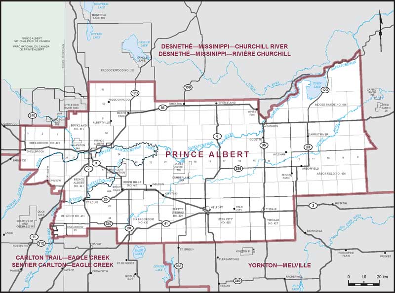 Comprend la partie de la province de la Saskatchewan décrite comme suit : commençant à l'intersection de la limite sud de la municipalité rurale de Shellbrook no 493 et de la rivière Saskatchewan Nord; de là vers l'ouest et vers le nord suivant les limites sud et ouest de ladite municipalité rurale jusqu'à un chemin sans nom, qui est aussi le prolongement vers l'ouest de la route no 240; de là vers l'est suivant ledit chemin sans nom, la route no 240 et le prolongement vers l'est de ladite route jusqu'à la limite ouest de la réserve indienne de Sturgeon Lake no 101; de là vers le sud, vers l'est et vers le nord suivant les limites ouest, sud et est de ladite réserve indienne jusqu'à la limite sud de la Sec 19 Tp 51 Rg 27 O 2; de là vers l'est suivant ladite limite jusqu'à la limite est de la Sec 19 Tp 51 Rg 27 O 2; de là vers le nord suivant ladite limite et la limite est des Sec 30 et 31 Tp 51 Rg 27 O 2 jusqu'à la limite nord de la municipalité rurale de Buckland no 491; de là généralement vers l'est suivant ladite limite jusqu'à la route no 2; de là vers le nord suivant ladite route et la limite ouest de la municipalité rurale de Paddockwood no 520 jusqu'à la limite sud du Tp 54; de là vers l'est suivant ladite limite jusqu'à la limite est de la municipalité rurale de Paddockwood no 520; de là vers le sud suivant ladite limite jusqu'à la limite sud de la Sec 30 Tp 52 Rg 21 O 2; de là vers l'est suivant la limite nord des Sec 19 à 24 Tp 52 Rg 21, Rg 20, Rg 19, Rg 18, Rg 17, Rg 16 et Rg 15 O 2 jusqu'à un chemin sans nom situé près de la limite ouest du Rg 14; de là vers le sud suivant ledit chemin et la route no 35 jusqu'à la route no 55; de là vers le sud et le sud-est suivant ladite route jusqu'à la rivière Saskatchewan; de là généralement vers le nord-est suivant ladite rivière, le lac Tobin et ladite rivière jusqu'à la limite est de la municipalité rurale de Moose Range no 486; de là généralement vers le sud et vers l'ouest suivant les limites est et sud de ladite municipalité rurale jusqu'à la limite est de la municipalité rurale d'Arborfield no 456; de là généralement vers le sud et vers l'ouest suivant les limites est et sud de ladite municipalité rurale jusqu'à la limite est de la municipalité rurale de Tisdale no 427; de là vers le sud et vers l'ouest suivant les limites est et sud de ladite municipalité rurale et la limite sud des municipalités rurales de Star City no 428, de Flett's Springs no 429 et d'Invergordon no 430 jusqu'à la limite ouest de la municipalité rurale d'Invergordon no 430; de là vers le nord suivant ladite limite jusqu'à la limite sud de la municipalité rurale de St. Louis no 431; de là vers l'ouest, vers le sud et vers l'ouest suivant ladite limite jusqu'à la limite sud de la réserve indienne de One Arrow no 95; de là généralement vers l'ouest suivant ladite limite jusqu'à la limite sud de la municipalité rurale de St. Louis no 431; de là généralement vers l'ouest suivant ladite limite jusqu'à la rivière Saskatchewan Sud; de là généralement vers le nord suivant ladite rivière jusqu'à la limite ouest de la municipalité rurale de Prince Albert no 461; de là vers le nord suivant ladite limite jusqu'à la limite sud de la Sec 1 Tp 46 Rg 1 O 3; de là vers l'ouest suivant la limite sud des Sec 1 et 2 Tp 46 Rg 1 O 3 jusqu'à la limite est de la Sec 34 Tp 45 Rg 1 O 3; de là vers le sud et l'ouest suivant les limites est et sud de la Sec 34 Tp 45 Rg 1 O 3 jusqu'à la limite sud de la Sec 33 Tp 45 Rg 1 O 3; de là vers l'ouest suivant la limite sud des Sec 33 et 32 Tp 45 Rg 1 O 3 jusqu'à la limite ouest de la Sec 32 Tp 45 Rg 1 O 3; de là vers le nord suivant ladite limite et vers le nord et l'est suivant les limites ouest et nord de la Sec 5 Tp 46 Rg 1 O 3 jusqu'à la limite ouest de la Sec 9 Tp 46 Rg 1 O 3; de là vers le nord suivant ladite limite jusqu'à un chemin sans nom situé près de la limite sud de la Sec 17 Tp 46 Rg 1 O 3; de là généralement vers le nord-ouest suivant ledit chemin sans nom jusqu'à son intersection avec un chemin sans nom situé à environ 53°02'23" de latitude N et 106°10'02" de longitude O; de là généralement vers l'ouest suivant ledit chemin sans nom et son prolongement vers l'ouest jusqu'à la rivière Saskatchewan Nord; de là généralement vers le nord-est suivant ladite rivière jusqu'au point de départ.