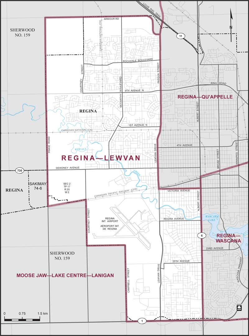 Comprend les parties de la province de la Saskatchewan et de la ville de Regina décrites comme suit : commençant à l'intersection de la rue Albert (route no 6) et de la route no 1; de là vers l'ouest suivant la route no 1 jusqu'à la rue Campbell; de là généralement vers le nord suivant ladite rue jusqu'à la limite ouest de la ville de Regina; de là vers le nord et vers l'ouest suivant ladite limite jusqu'à la voie ferrée du Canadien Pacifique; de là vers le sud-ouest suivant ladite voie ferrée jusqu'au chemin Pinkie (près de la limite ouest de la Sec 21 Tp 17 Rg 20 O 2); de là vers le nord suivant ledit chemin jusqu'au chemin Armour; de là généralement vers l'est et vers le sud suivant le chemin Armour jusqu'à la rue Pasqua; de là vers le sud suivant ladite rue jusqu'à la promenade Lewvan; de là vers le sud suivant ladite promenade jusqu'au prolongement de l'avenue Victoria; de là généralement vers l'est suivant ledit prolongement et l'avenue Victoria jusqu'à la rue Albert; de là vers le sud suivant ladite rue jusqu'au point de départ.