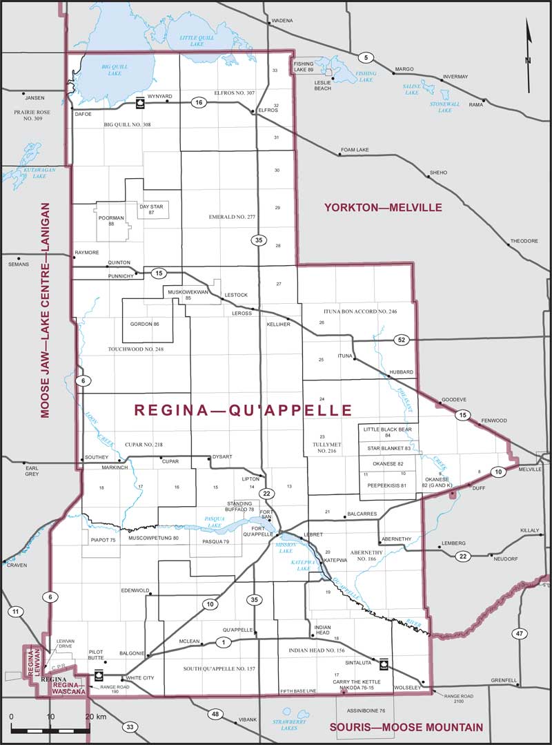Comprend les parties de la province de la Saskatchewan et de la ville de Regina décrites comme suit : commençant à l'intersection du chemin de rang 2100 et de la 5e ligne de base; de là vers l'ouest suivant la 5e ligne de base et son prolongement intermittent jusqu'à la limite est de la réserve indienne Carry The Kettle Nakoda no 76-15; de là vers le nord, l'ouest et le sud suivant les limites est, nord et ouest de ladite réserve indienne jusqu'à la limite sud de la municipalité rurale d'Indian Head no 156; de là vers l'ouest suivant ladite limite et la limite sud de la municipalité rurale de South Qu'Appelle no 157 jusqu'à la route no 48; de là vers l'ouest suivant ladite route et la 5e ligne de base jusqu'au chemin de rang 190; de là vers le nord suivant ledit chemin jusqu'à la route no 1; de là vers l'ouest suivant ladite route jusqu'à la limite est de la ville de Regina; de là vers le nord suivant ladite limite jusqu'à la voie ferrée du Canadien Pacifique; de là vers le sud-ouest suivant ladite voie ferrée jusqu'à la rue Albert; de là vers le sud suivant ladite rue jusqu'à l'avenue Victoria; de là vers l'ouest suivant ladite avenue et son prolongement vers la promenade Lewvan; de là vers le nord suivant ladite promenade, la rue Pasqua et la rue Pasqua Nord jusqu'à un chemin sans nom situé près de la limite nord de la Sec 24 Tp 18 Rg 20 O 2; de là vers l'est suivant ledit chemin jusqu'à la route no 6; de là généralement vers le nord suivant ladite route jusqu'à la limite ouest de la municipalité rurale de Cupar no 218; de là généralement vers le nord suivant ladite limite et la limite ouest de la municipalité rurale de Touchwood no 248 jusqu'à la route no 6 au sud de la limite nord de la Sec 30 Tp 25 Rg 18 O 2; de là vers le nord suivant ladite route jusqu'à la limite ouest de la municipalité rurale de Big Quill no 308; de là généralement vers le nord suivant ladite limite jusqu'à la route no 6; de là vers le nord suivant ladite route jusqu'à la limite nord de la municipalité rurale de Prairie Rose no 309; de là vers l'est suivant ladite limite et la limite nord des municipalités rurales de Big Quill no 308 et d'Elfros no 307 jusqu'à la limite est de la municipalité rurale d'Elfros no 307; de là vers le sud suivant ladite limite et la limite est de la municipalité rurale d'Emerald no 277 jusqu'à la limite nord de la municipalité rurale d'Ituna Bon Accord no 246; de là vers l'est et vers le sud suivant les limites nord et est de ladite municipalité rurale et la limite est de la municipalité rurale de Tullymet no 216 jusqu'à la route no 15; de là généralement vers le sud-est suivant ladite route jusqu'à la limite ouest du village de Goodeve; de là vers le sud, l'est et le nord suivant les limites ouest, sud et est dudit village jusqu'à la route no 15; de là vers le sud-est suivant ladite route jusqu'à la limite ouest du village de Fenwood; de là vers le sud, vers l'est et vers le nord suivant les limites ouest, sud et est dudit village jusqu'à la route no 15; de là vers le sud-est suivant ladite route jusqu'à la limite est de la Sec 8 Tp 23 Rg 7 O 2; de là vers le sud suivant ladite limite et la limite est de la Sec 5 Tp 23 Rg 7 O 2 jusqu'à la limite nord de la Sec 32 Tp 22 Rg 7 O 2; de là vers l'est et vers le sud suivant ladite limite et la limite est de la Sec 32 Tp 22 Rg 7 O 2 jusqu'à la limite nord de la Sec 28 Tp 22 Rg 7 O 2; de là vers l'est et vers le sud suivant ladite limite et la limite est de la Sec 28 Tp 22 Rg 7 O 2 et de la Sec 21 Tp 22 Rg 7 O 2 jusqu'à la route no 10; de là généralement vers le sud-ouest suivant ladite route jusqu'à la limite est du village de Duff; de là vers le nord, vers le sud-ouest et vers le sud suivant les limites est, nord-ouest et ouest dudit village jusqu'à la route no 10; de là vers le sud-ouest suivant ladite route jusqu'à la limite est de la réserve indienne d'Okanese no 82 (G et K); de là vers le sud, vers l'ouest et vers le nord suivant les limites est, sud et ouest de ladite réserve indienne jusqu'à la route no 10; de là vers le sud-ouest suivant ladite route jusqu'à la limite est de la réserve indienne d'Okanese no 82 (M); de là vers le sud et vers l'ouest suivant les limites est et sud de ladite réserve indienne jusqu'à la route no 10; de là vers le sud-ouest suivant ladite route jusqu'à la limite est de la municipalité rurale d'Abernethy no 186; de là généralement vers le sud suivant ladite limite jusqu'au chemin de rang 2100; de là généralement vers le sud suivant ledit chemin et ses prolongements intermittents jusqu'au point de départ.